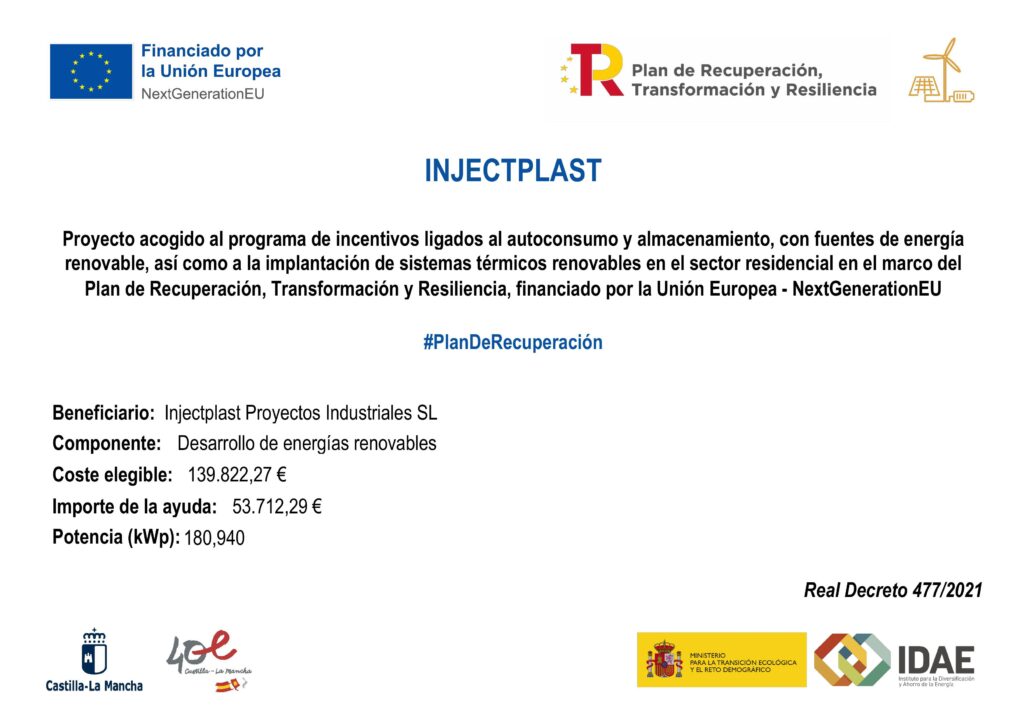 Beneficiario: Injectplast proyectos industriales s.l. Inversión total: 1.284.125,47 € Importe de la ayuda: 385.237,64 €